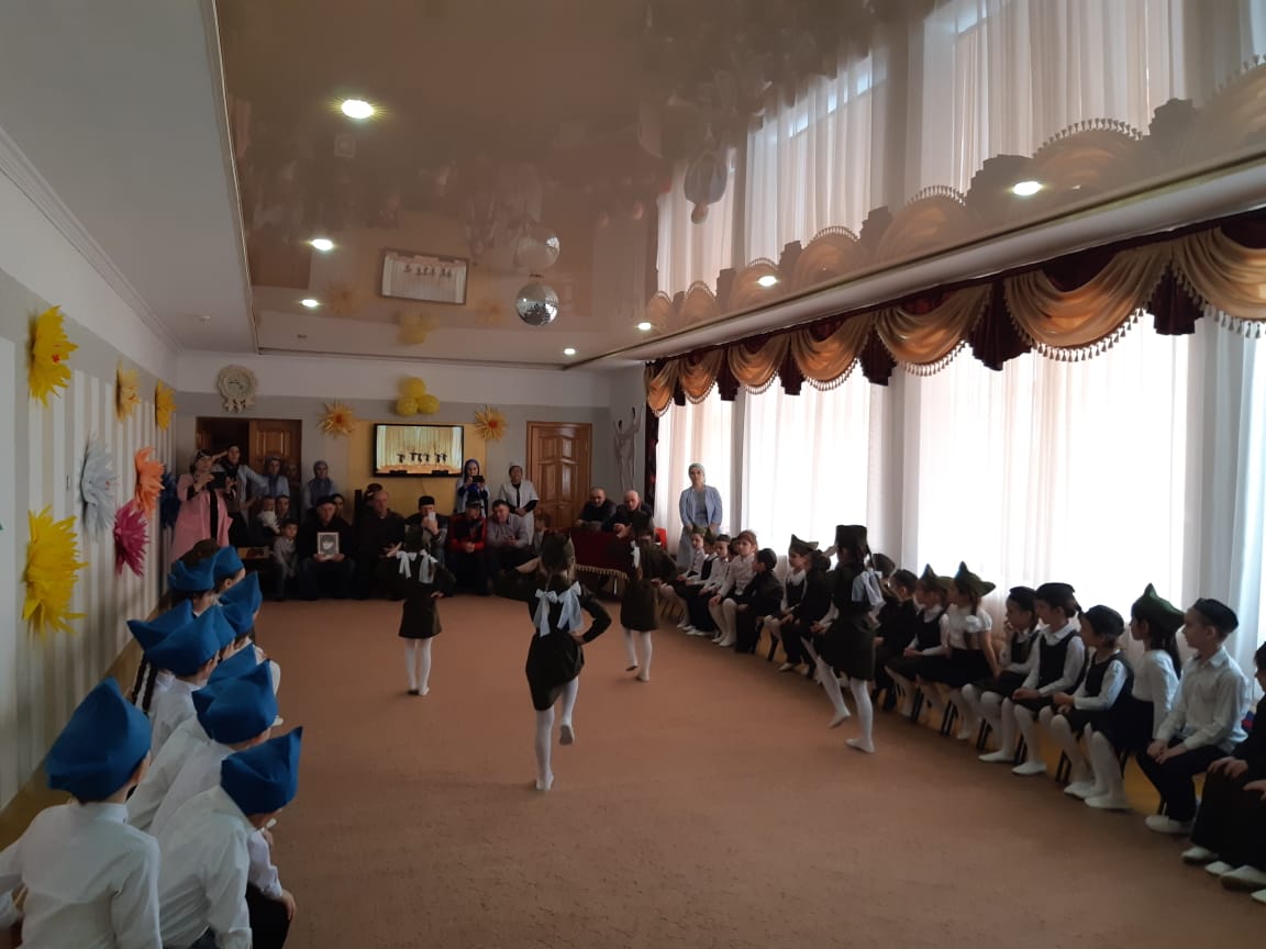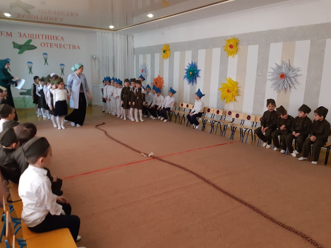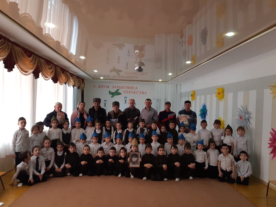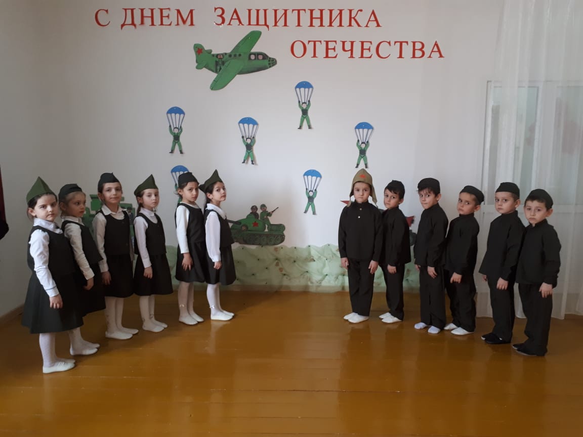 22.02.2019Цель: формирование социально - нравственного воспитания, уважительного отношения к взрослым, защитникам Отечества, ветеранам войны. Согласно годовому плану в МБДОУ «Детский сад №8 «Солнышко» с. Новотерское» с 18 по 22.02. 2019 года проводились беседы во всех возрастных группах, по данным темам, в соответствии с возрастом и тематическим планированием. В группах планировали чтение художественной литературы на военную тему, воспитатели читали и учили с детьми пословицы, поговорки о силе, смелости, ловкости, военной службе, заучивали стихотворения, песни. В течение этих дней проводили просмотр видеороликов и фильмов на темы: «Армия родная», «Военная техника». На ООД по ИЗО, воспитанники изготавливали и подарили праздничные открытки «Подарок папам, дедушкам, поздравление мальчиков и гостей детского сада. Воспитанники старшей группы «Улыбка» совместно с воспитателя подготовили стенгазету « Папа может все, что угодно». Инструктор по ФК – Исаева З.Х. и музыкальный руководитель провели спортивно-музыкальный праздник «Защитники Отечества», где дети не только показали свою смелость, ловкость, умение выполнять задание, но и творческие способности: умение читать стихи, петь, танцевать.