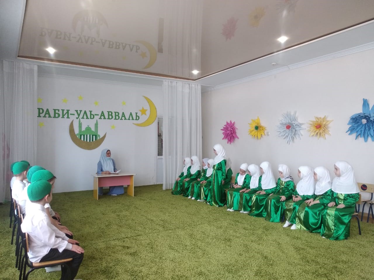 Воспитатели старших групп оформили стенды по духовно-нравственному воспитанию дошкольников. Педагог дополнительного образования 27.10.2020 г. провела тематическую беседу с детьми старшей группы на тему: «Пророк Мухаммад (да благословит его Аллах и приветствует) – свет души и сердца»; 29.10.2020 г. провела беседу с педагогами на тему: «Сунна пророка Мухаммада (да благословит его Аллах и приветствует). 30.10.2020 г. в актовом зале ДОУ прочитали Мовлид, в честь дня рождения Пророка Мухаммада (да благословит его Аллах и приветствует).